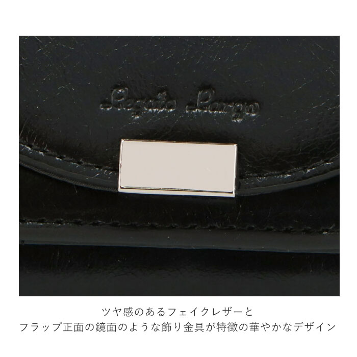 ・ツヤ感のあるフェイクレザーと、フラップ正面の鏡面のような飾り金具が印象的な華やかなデザイン。